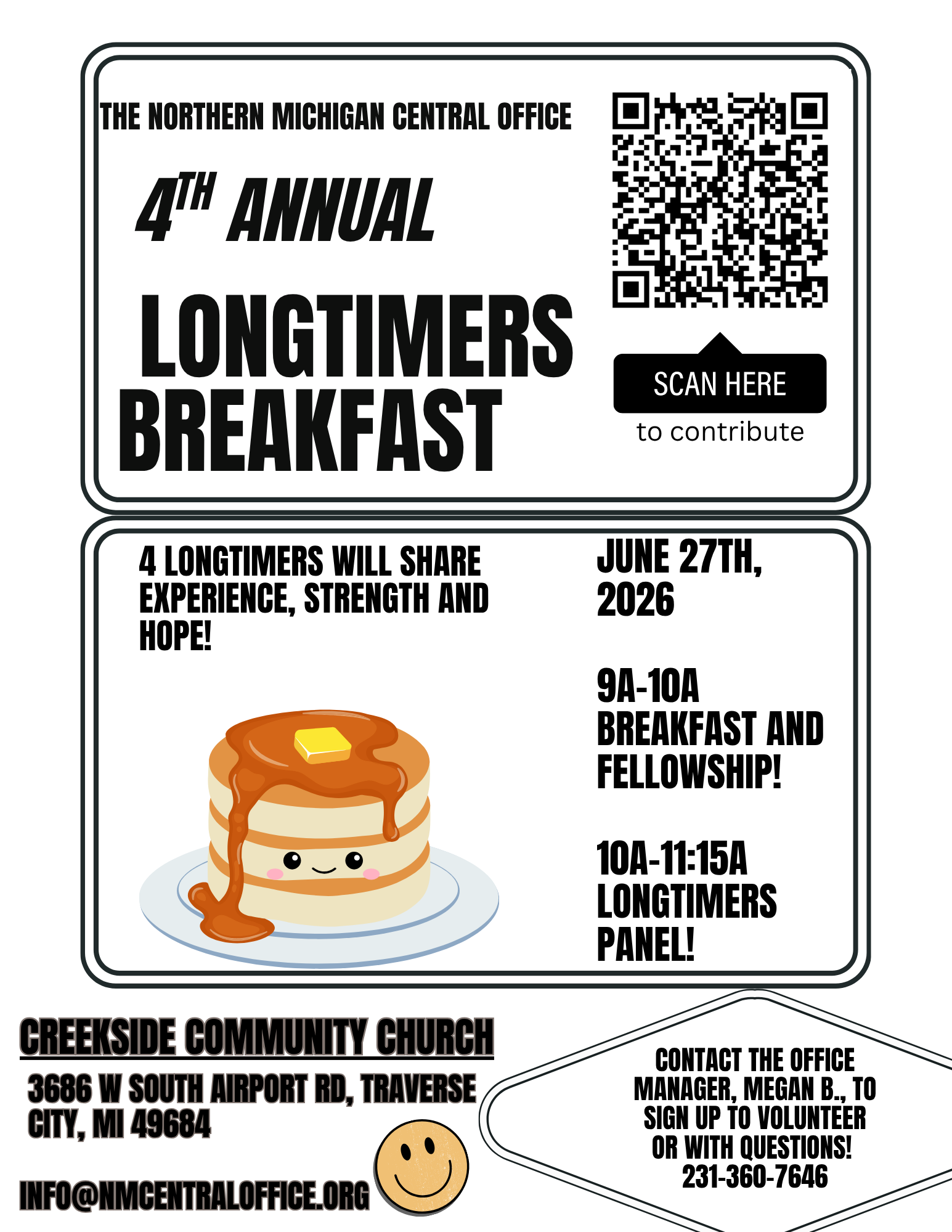 The Northern Michigan Central Office is hosting its 4th Annual Longtimers Breakfast! Breakfast will be served at 9am, with a panel of Longtimers sharing their experience, strength, and hope at 10am. Located at the Creekside Community Church (3686 W South Airport Rd, Traverse City, MI 49684) across from Sams Club. Click here for a flyer with more information!